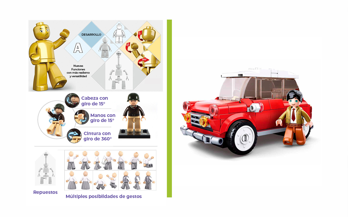 Nuestra línea de bloques de construcción incluye una innovadora gama de minifiguras (personajes articulados) cuya versatilidad, diseño y calidad, superan con creces a su competencia, incluso de las marcas más reconocidas del rubro.