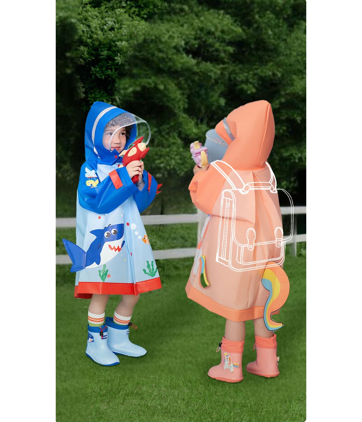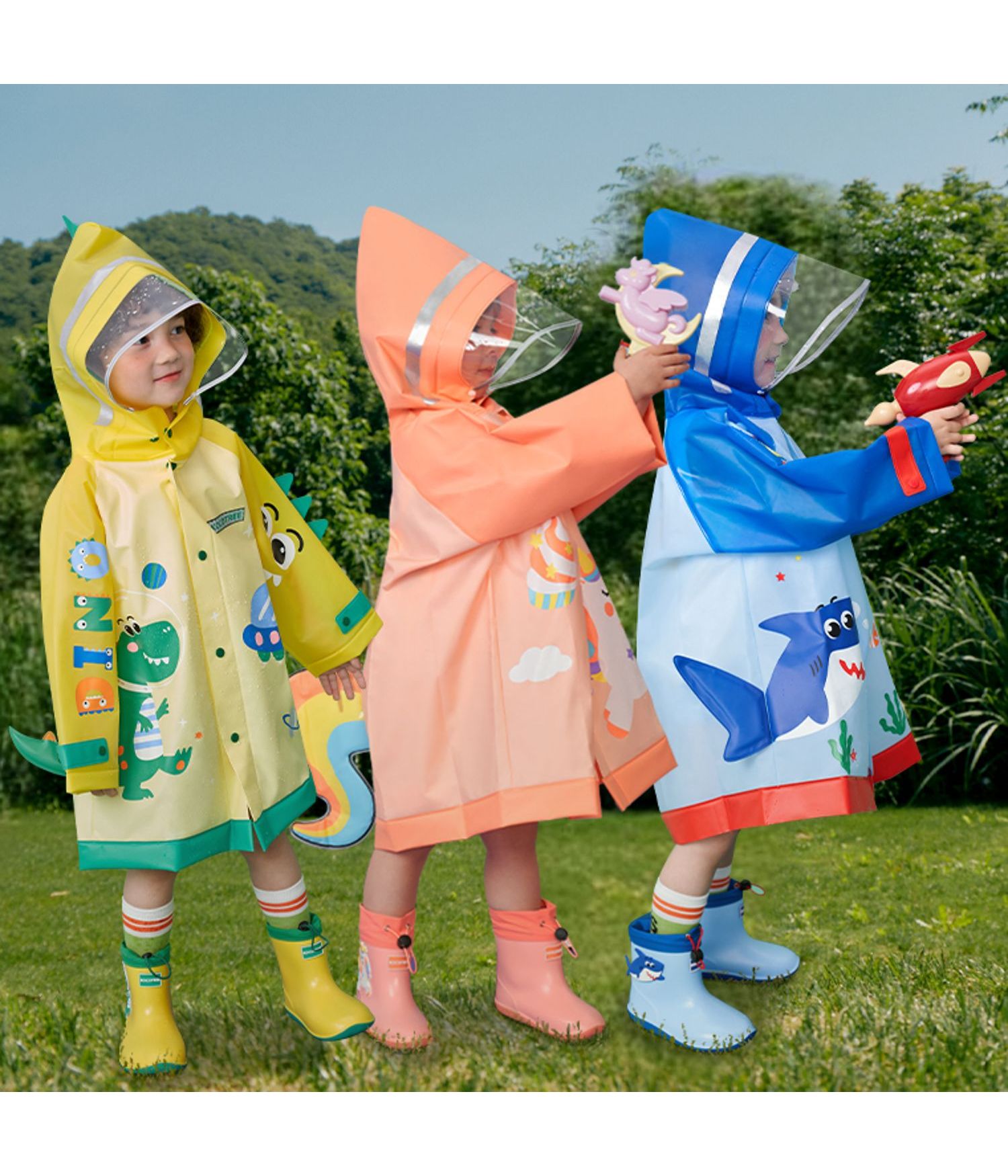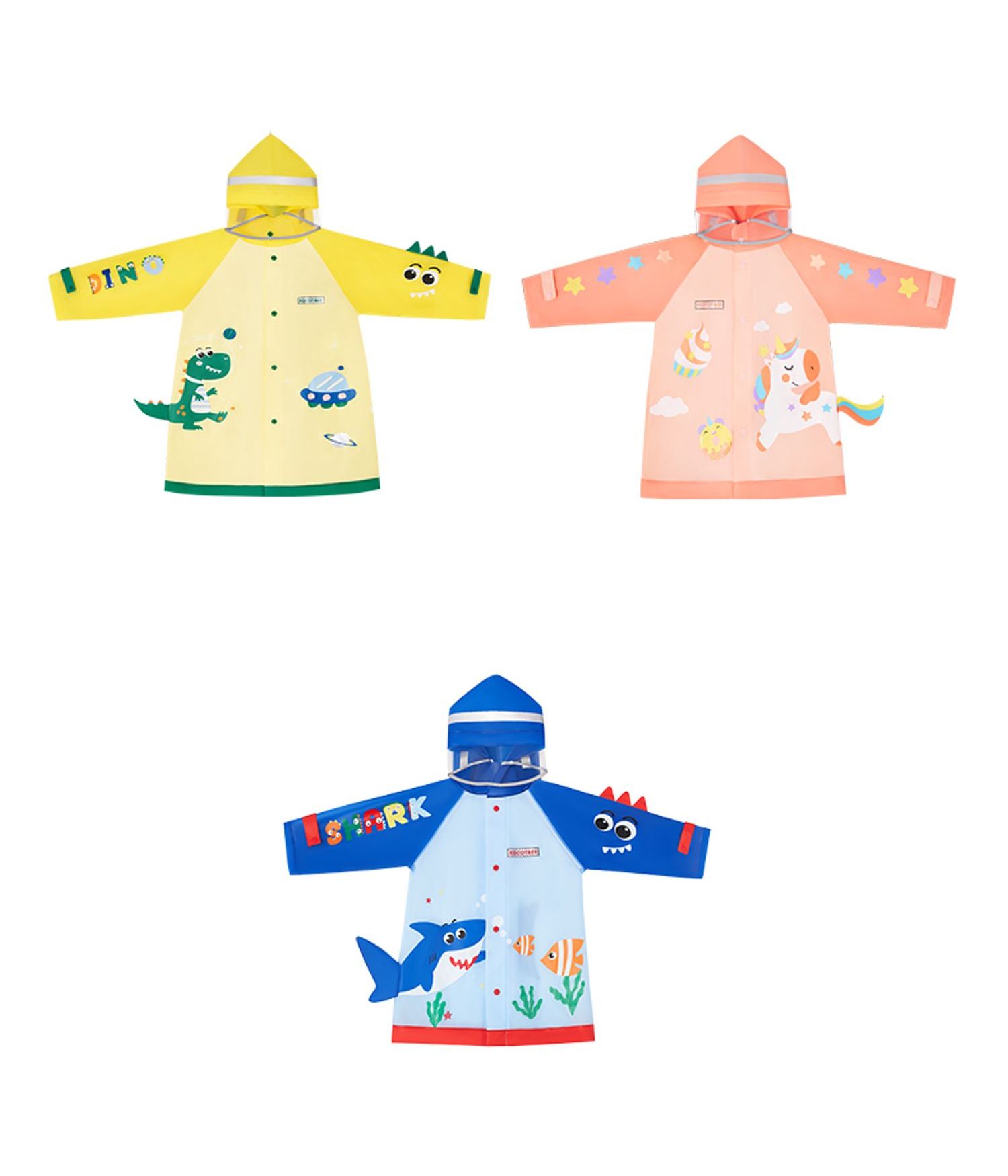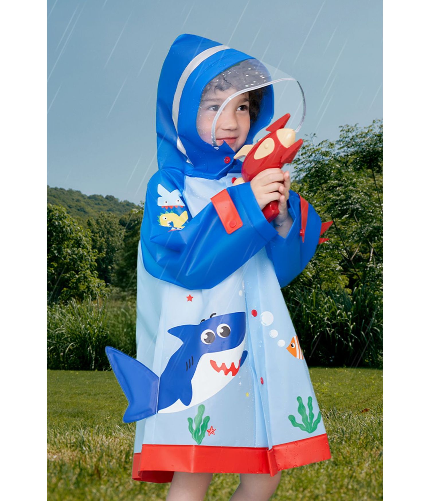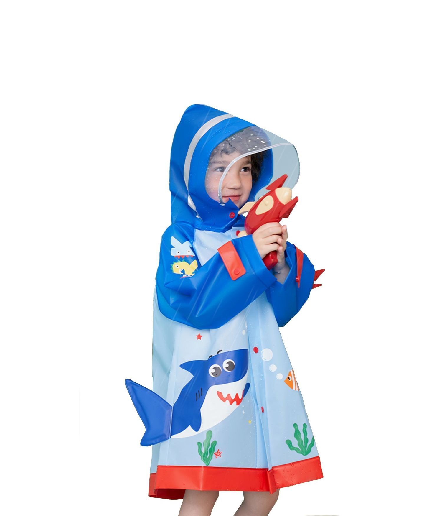 Te gusta la lluvia?, pues con esta capa para la lluvia impermeable para niños, podrás surcar los caminos sin preocuparte por la lluvia que cae, ya que ninguna gota podrá alcanzarte durante tu travesía. Hay tres hermosos modelos coloridos para ti, un tiburón azul, un unicornio rosado o un dinosaurio amarillo, que incluso podrían considerarse un disfraz, elige el que más te guste. Disponibles en 2 tamaños (M y L).