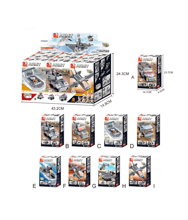 Estos bloques didácticos de 1001 piezas, te permiten armar junto a tus amigas o amigos, una completa línea de fuerzas de aire, mar y tierra. Distribuidas en 9 cajitas individuales de 14,1x23x4,5 cm. Cada una de estas cajitas por sí sola te permite armar tres variaciones de cada vehículo, A) un camión, B) un tanque, C) un jeep, D) una lancha tipo zodiac, E) una camioneta, F) una lancha, G) un helicóptero, H) Vehículos aéreos, I) un avión jet. Cada una de estas cajitas individuales trae también una figurita. Úsalas todas juntas siguiendo las instrucciones que vienen en el interior de la caja principal para armar un portaviones de 46,8 cm. de largo y pasar un gran momento de pura diversión para ti, tu familia y amigos. Este juguete armable de Fuerzas de Aire, Mar y Tierra, beneficia el desarrollo motriz permitiendo que, además de entretenerse, los niños y niñas puedan desarrollar sus habilidades cognitivas. Nuestros bloques de construcción son compatibles con otros bloques de construcción que usen piezas tipo M38