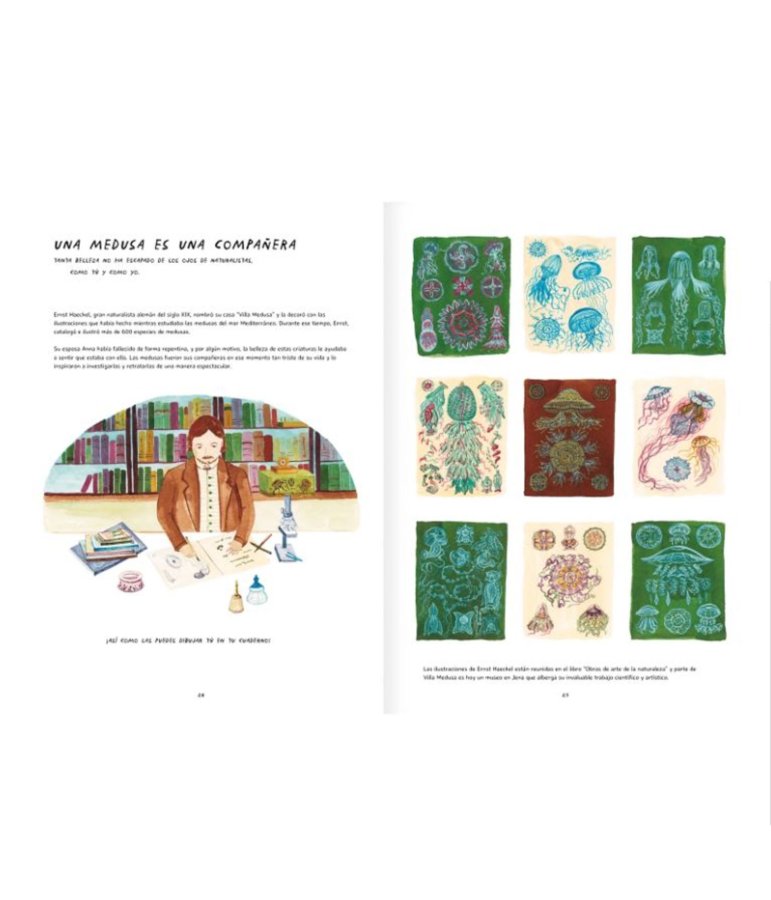 Con amplios estudios en ilustración naturalista, Lazzarino retrata de manera fiel los diversos tipos de medusa que existen en el mundo, junto con descripciones precisas, dibujos para identificar su anatomía y curiosidades que resultan sumamente útiles.