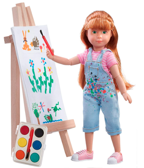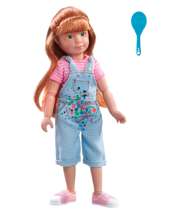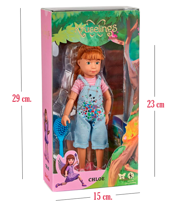 Esta es la muñeca Kruselings estilo artista Chloe. Chloe usa una camiseta, un overol de mezclilla, zapatillas rosas y trae su propio cepillo para el cabello. Chloe es una muñeca de 23 centímetros de vinilo de alta calidad con articulaciones móviles y ojos de cristal realistas. A partir de 3 años. (NO SE INCLUYE EL ATRIL QUE SE VE EN LAS IMÁGENES)