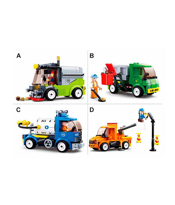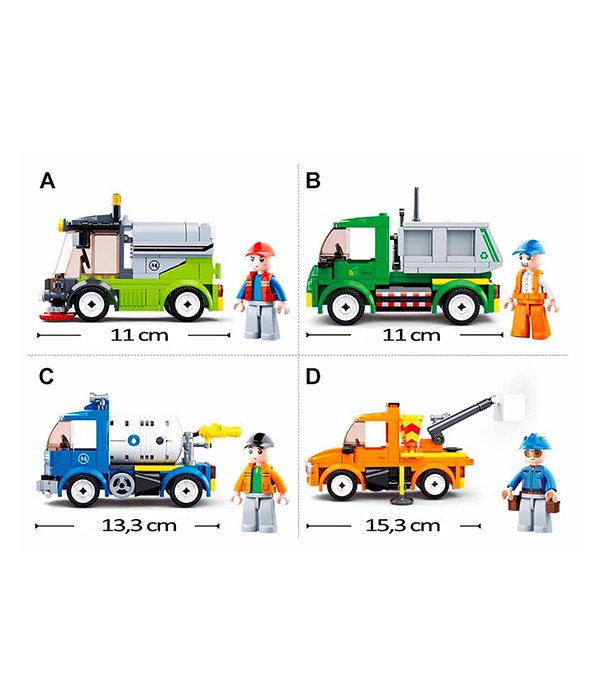Hay mucho trabajo que hacer en la ciudad, este pack de 8 camiones de ciudad armable de 994 piezas, te ayudará con todo lo que necesitas, diviértete mucho. El pack contiene 8 cajas con 4 modelos diferentes ( 2 Camiones de mantención eléctrica, 2 camiones de lavado de calles, 2 camiones de barrido de calles y 2 camiones recolectores de basura). Cada cajita incluye la figurita del conductor del camión. En total son 994 piezas que te brindarán diversión total. Este tipo de juguetes beneficia el desarrollo motriz permitiendo que, además de entretenerse, los niños y niñas puedan desarrollar sus habilidades cognitivas. Nuestros bloques de construcción son compatibles con otros bloques de construcción que usen piezas tipo M38.