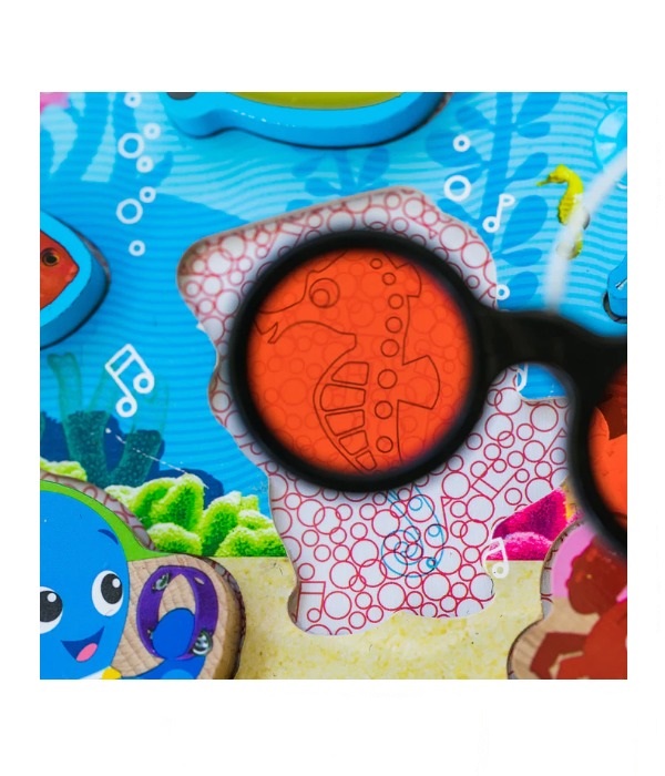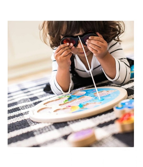 Con este precioso Puzle el peque podrá descubrir las imágenes que oculta. Cuando retire las piezas, con las gafas, podrá ver qué oculta cada pieza. Siete piezas de rompecabezas con las que se puede jugar por separado. Incluye gafas para descubrir secretos ocultos.