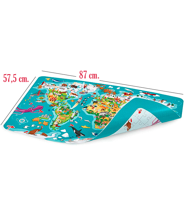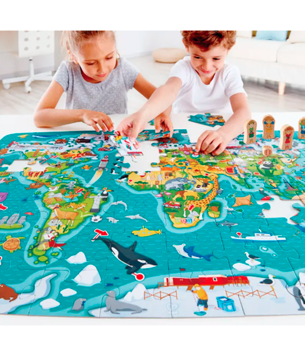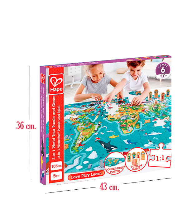 Los peques podrán realizar carreras con sus amigos por todo el mundo con este divertido juego dos en uno. Primero podrán completar el rompecabezas de 105 piezas que muestra los países del mundo con bonitas ilustraciones para así aprender sobre las distintas naciones, faunas silvestres y paisajes. A continuación, podrán usar los personajes de madera para desplazarse por cada continente.