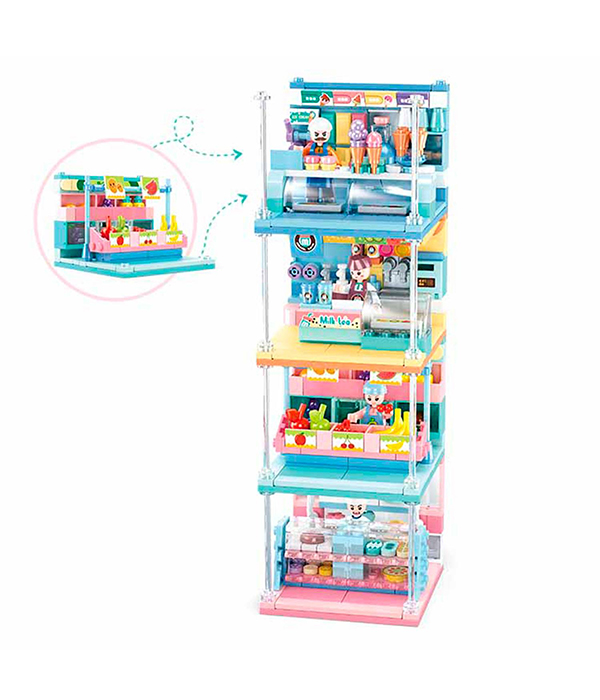 ¿Te gustaría ser un comerciante exitoso? aquí tienes tiendas con diferentes productos para elegir para que pruebes suerte. El set está compuesto de 4 cajas, con 4 modelos diferentes, 1 Heladería, 1 Tienda de Jugos, 1 Frutería y 1 Pastelería . Cada una de las tiendas trae su propio vendedor. Entre ellas, se pueden enlazar horizontalmente de manera de crear una especie de mercado o bien se pueden montar una sobre otra de manera vertical. Son 434 piezas en total que permiten desarrollar tu imaginación y construir tu mundo, para pasar momentos muy entretenidos con tus amig@s. Este tipo de juguetes beneficia el desarrollo motriz permitiendo que, además de entretenerse, los niños y niñas puedan desarrollar sus habilidades cognitivas. Nuestros bloques de construcción son compatibles con otros bloques de construcción que usen piezas tipo M38.
